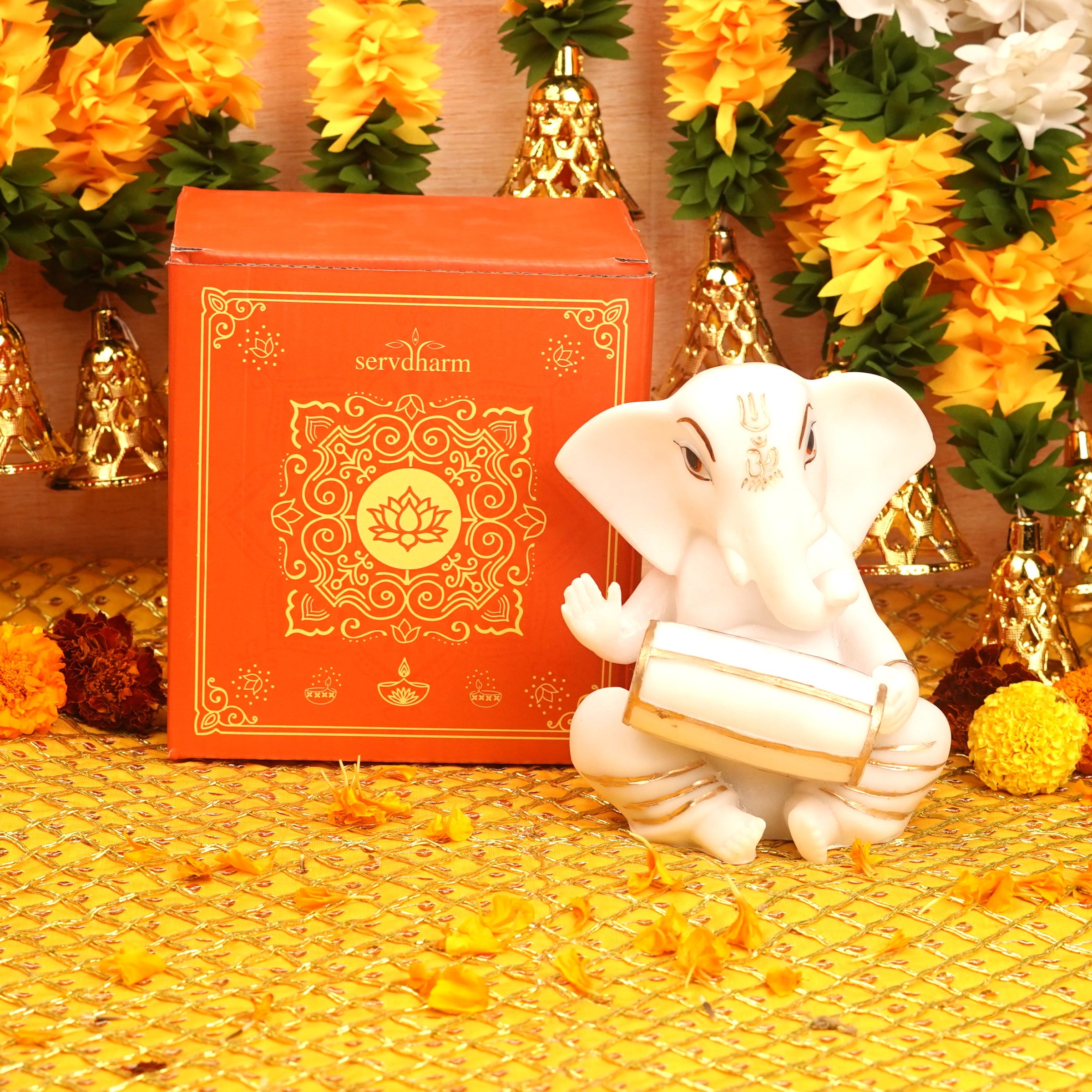 Marble Dust Ganesha Playing Dholak Idol 5.5 inch
