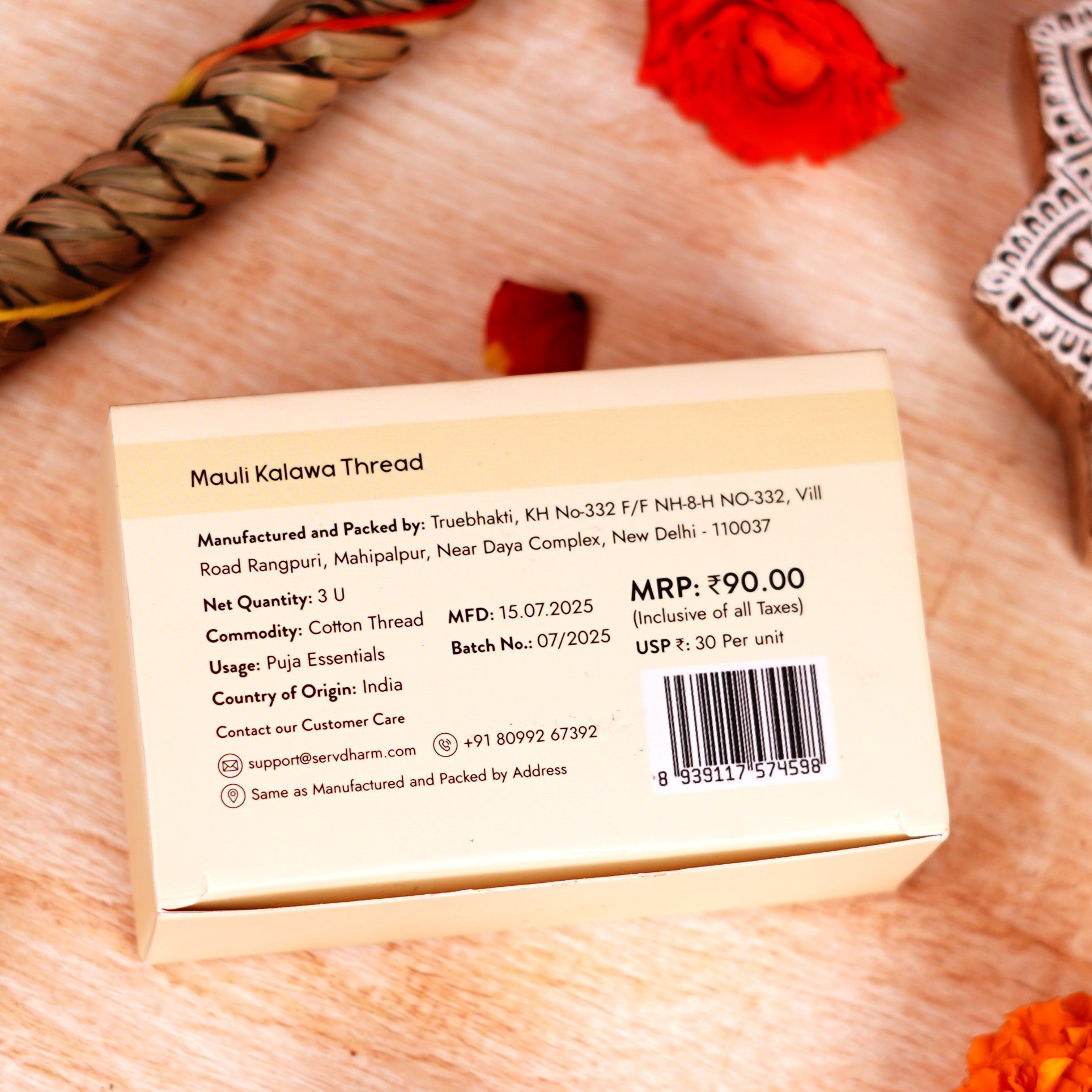 Mauli Kalawa is a sacred thread used in Hindu religious and cultural traditions. It is also known as "Mouli" or "Kalawa" in different regions of India. This thread is typically tied around the wrist during religious ceremonies, festivals, and other auspicious occasions. The practice dates back to the legend of Vamana tying the Raksha Dhaga on the wrist of King Bali to grant him immortality and the power to rule over the underworld.