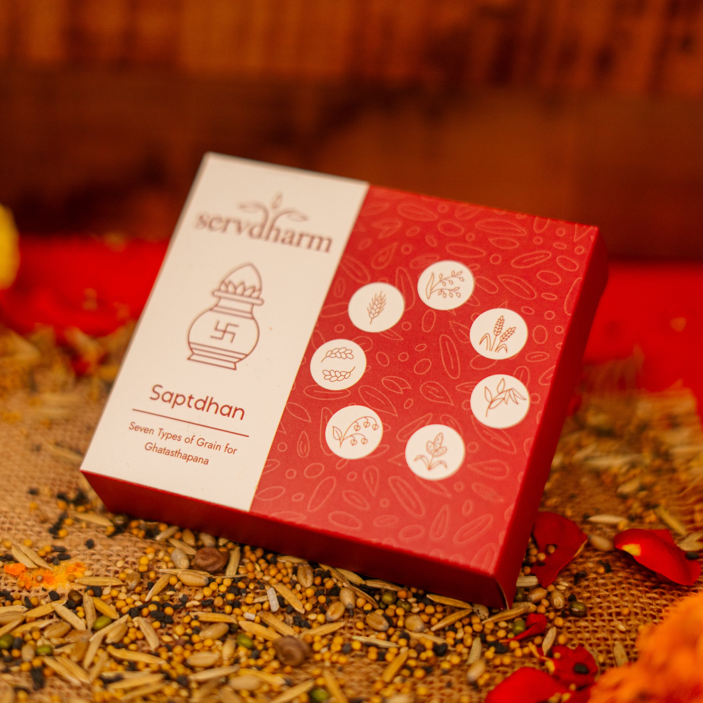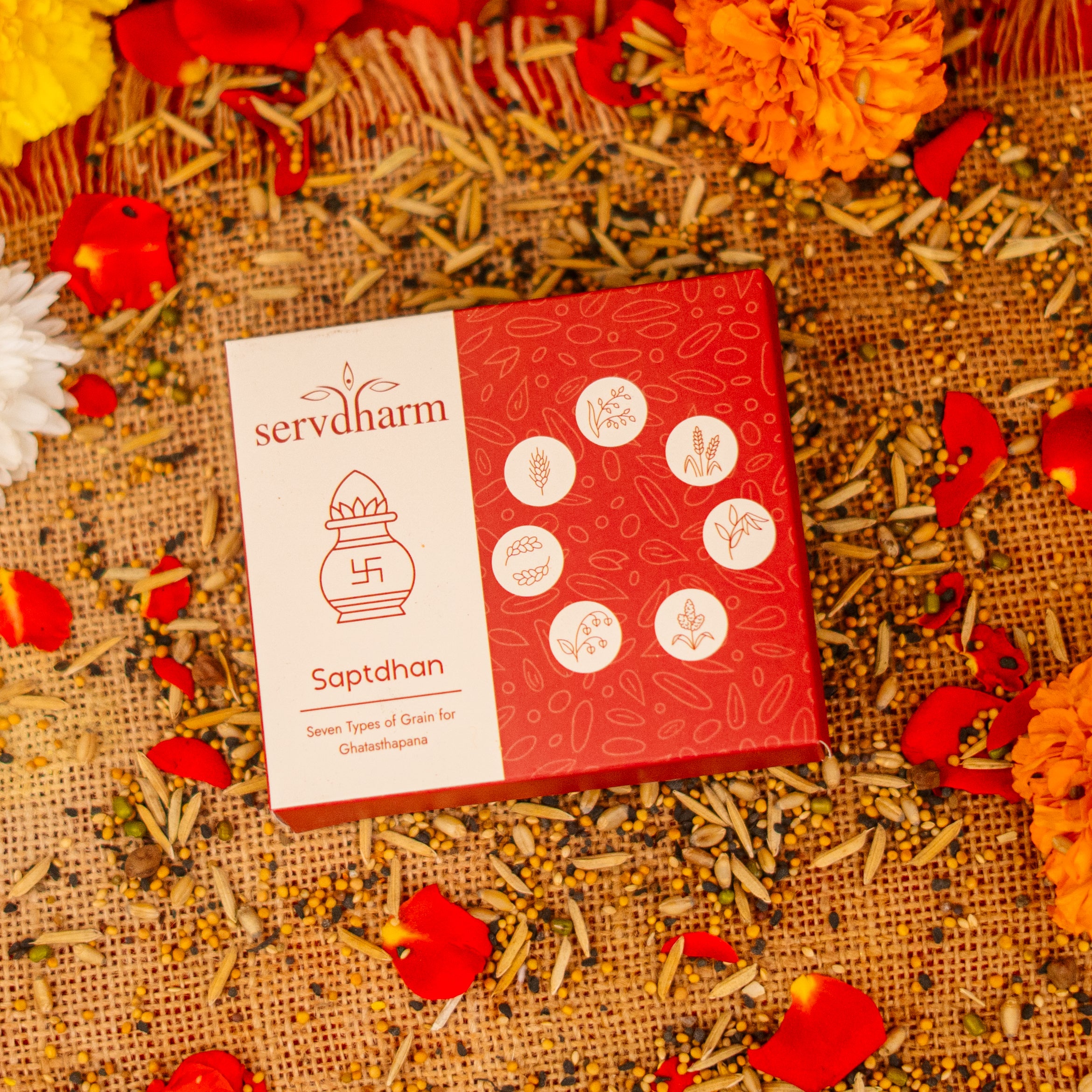 Saptdhan by ServDharm is a 50 gm pack of 7 types of seeds for ghatasthapana ritual.