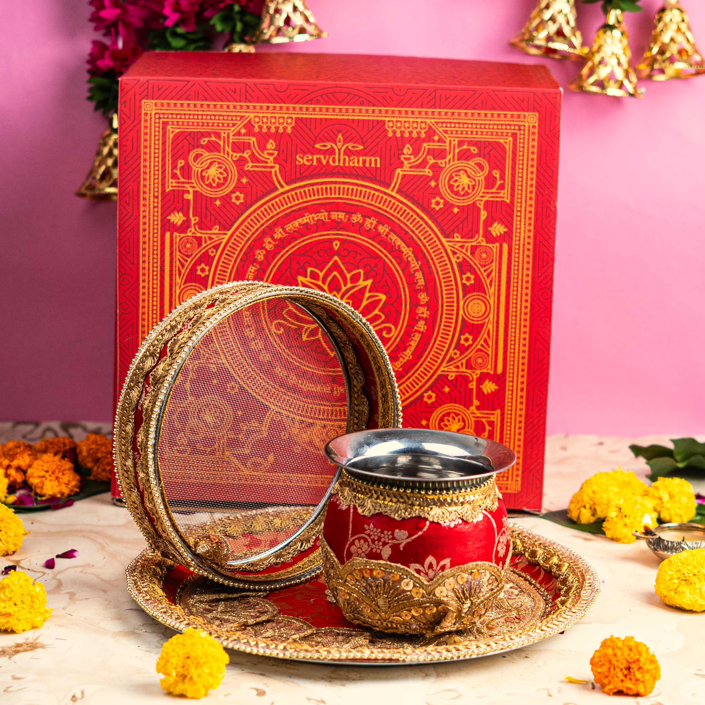 Red Karwa Chauth Thali Set | Luxe Edition | Pack of 3