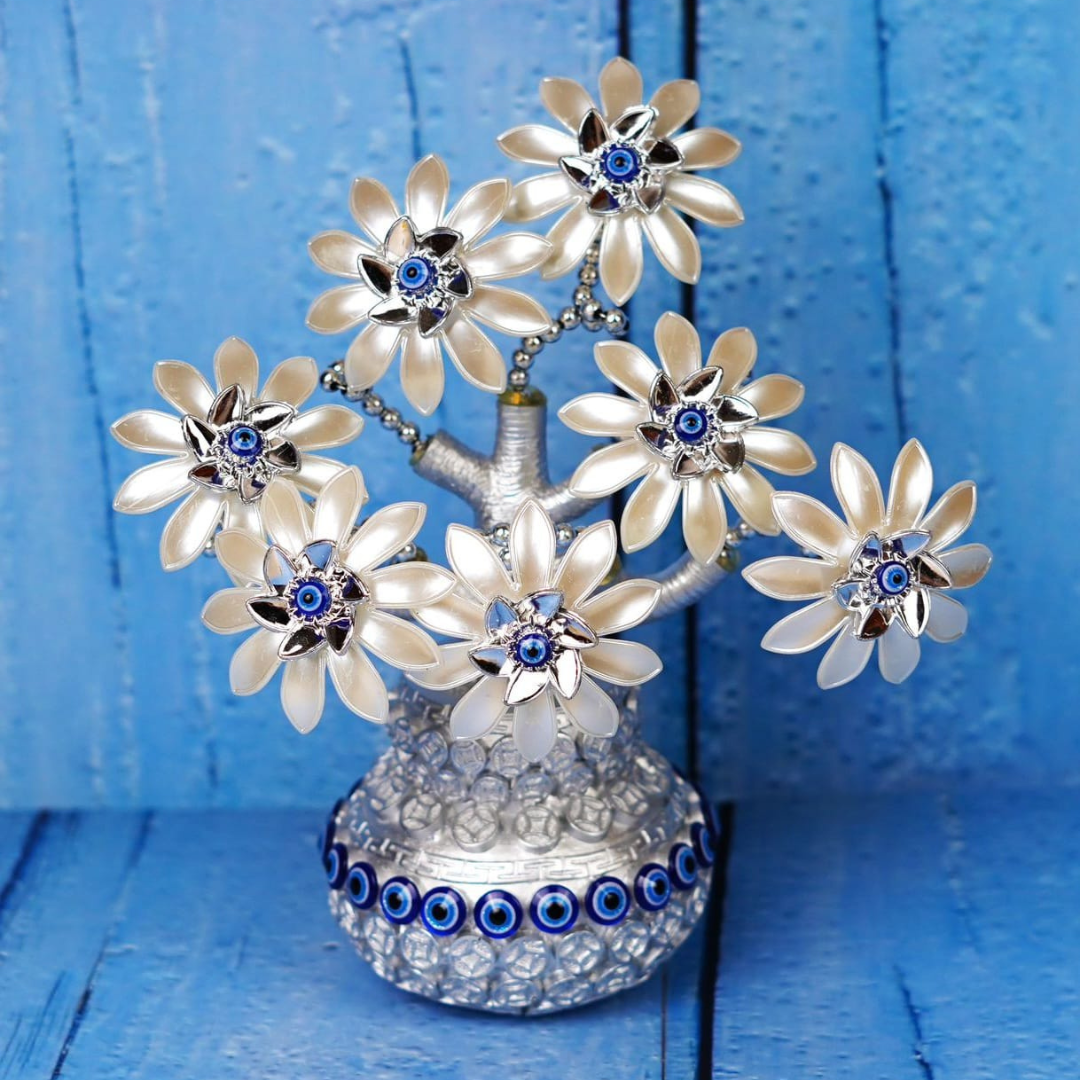 The flowers emerge from an ornate silver-toned base, decorated with intricate textures and a ring of mini evil eye motifs. Its metallic sheen and detailed craftsmanship make it a perfect décor piece for homes, offices and sacred spaces.
