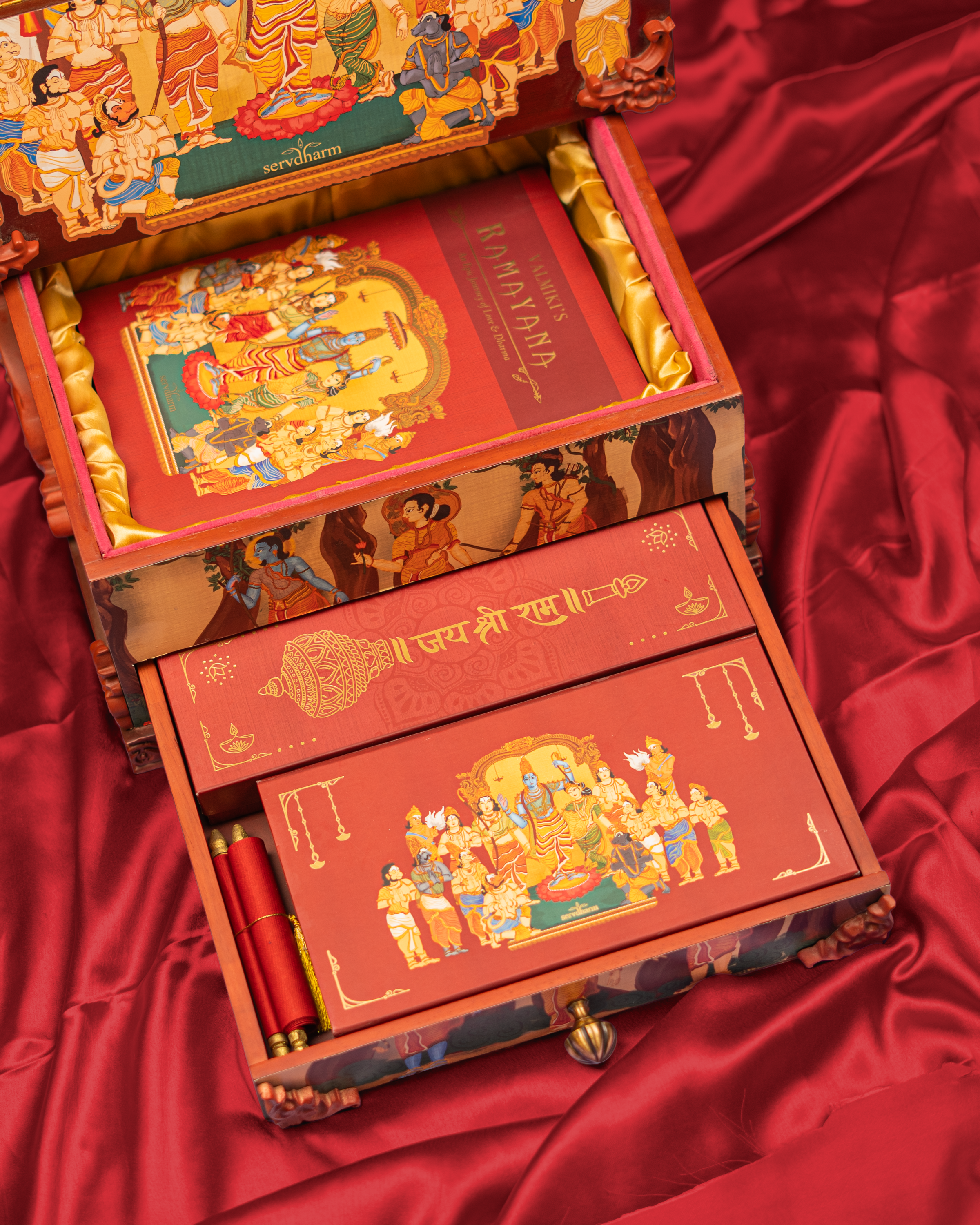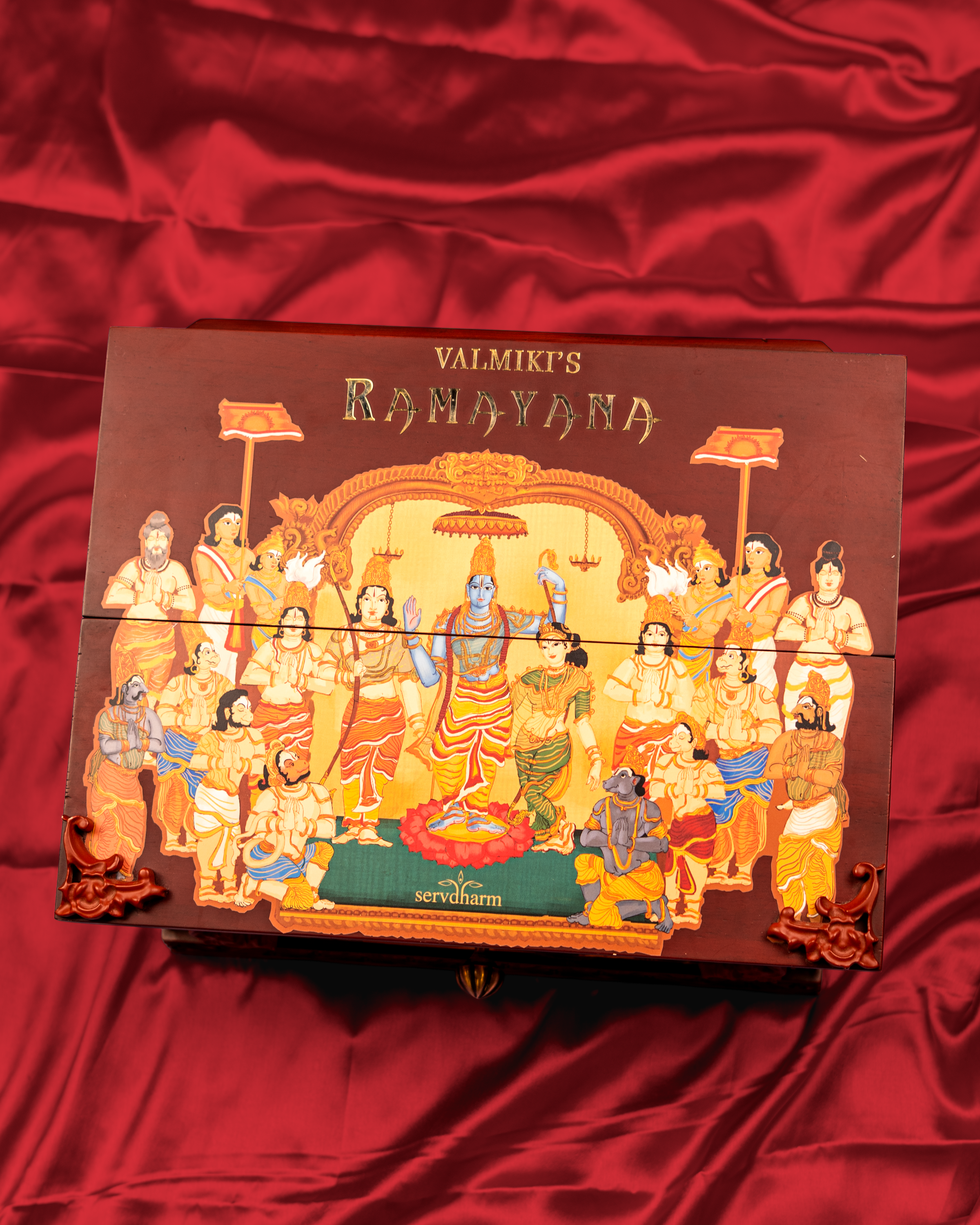 In the living tradition of Sanatan Dharma, the greatest treasures are not of gold or jewels, but of scripture, faith, and devotion. ServDharm’s Handcrafted Wooden Ramayana Gift Box, made from real wood and adorned with intricate depictions from the holy Ramayana, is one such treasure. It is not merely a gift—it is a vessel of blessings, carrying the eternal light of Lord Ram into every home.