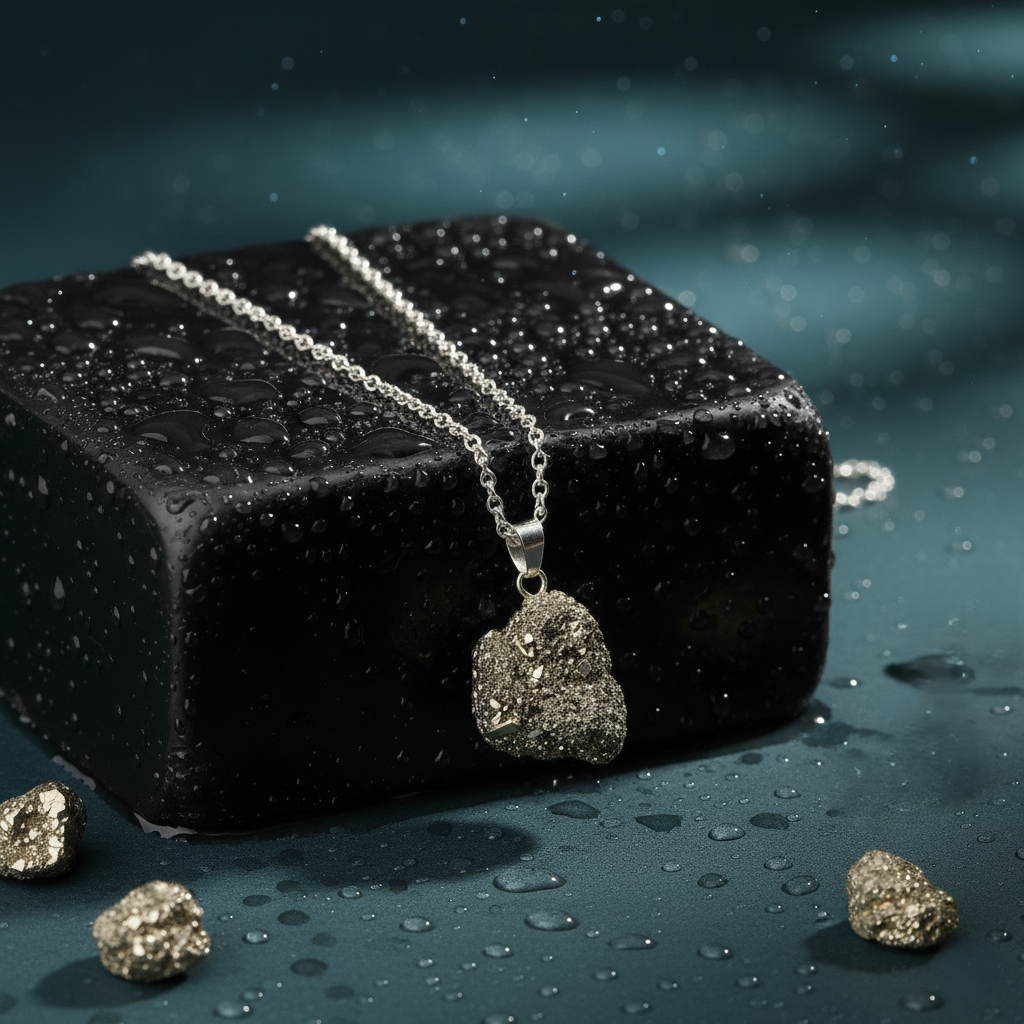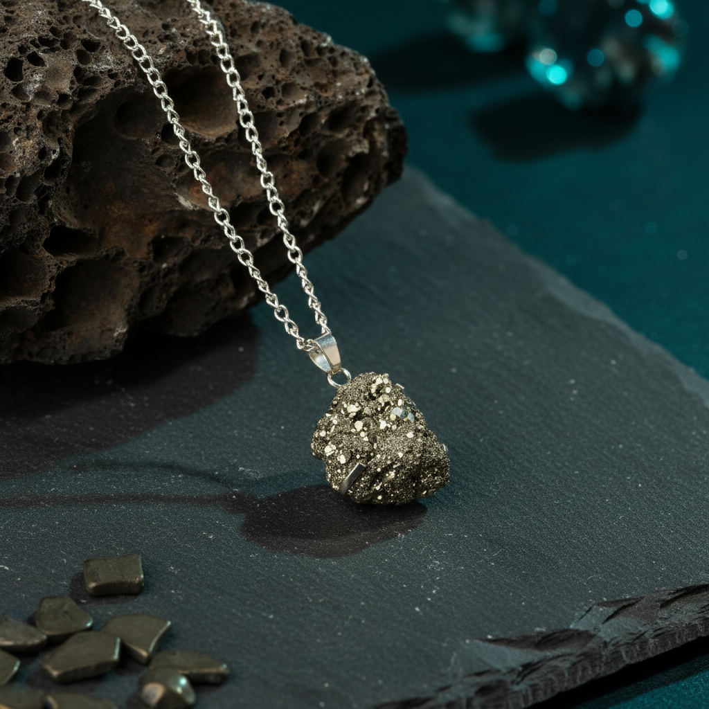 This striking pendant features a natural, raw Pyrite nugget, showcasing the stone's organic, metallic luster just as it was formed by the Earth. Known as the "Stone of Success," Pyrite is worn to enhance willpower, foster mental clarity, and attract abundance. Complete with a quality chain, this piece is a sophisticated and powerful statement of intent.