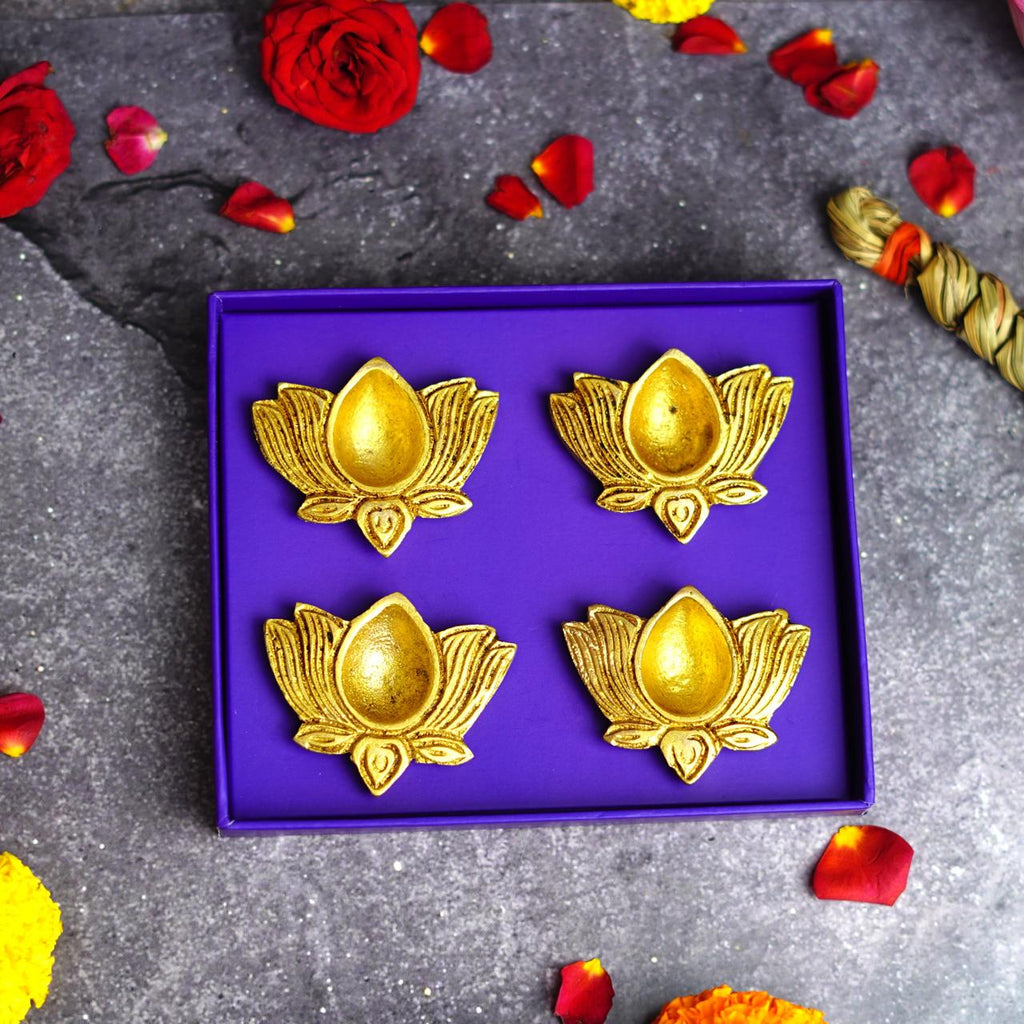 Pure Brass Kamal Diya (Set of 4 Diyas) Chandan Oil Gift Set