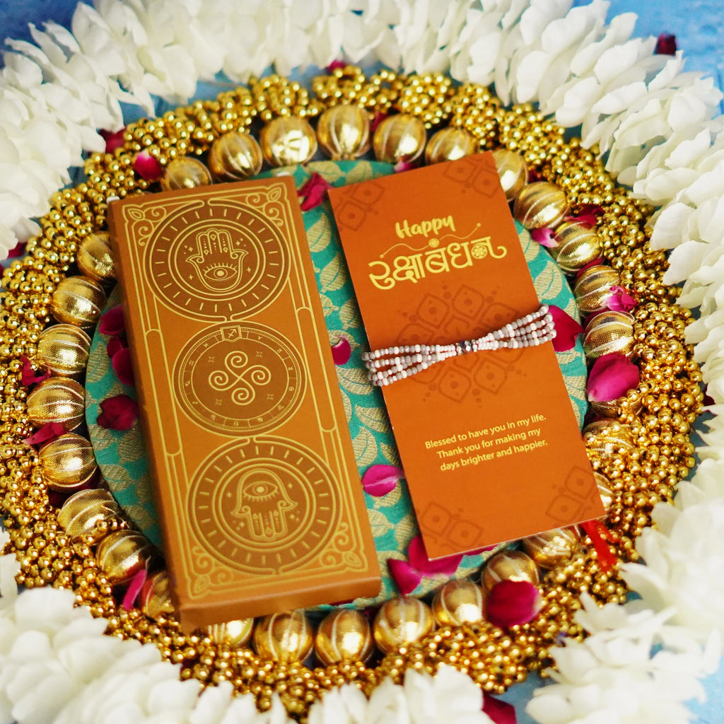 Handcrafted Evil Eye Beaded Rakhi with Dual Panel Design and Satin Thread and Pearl Accents