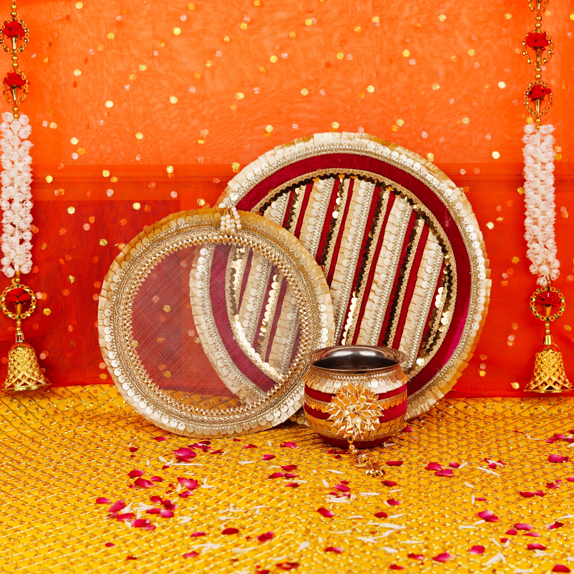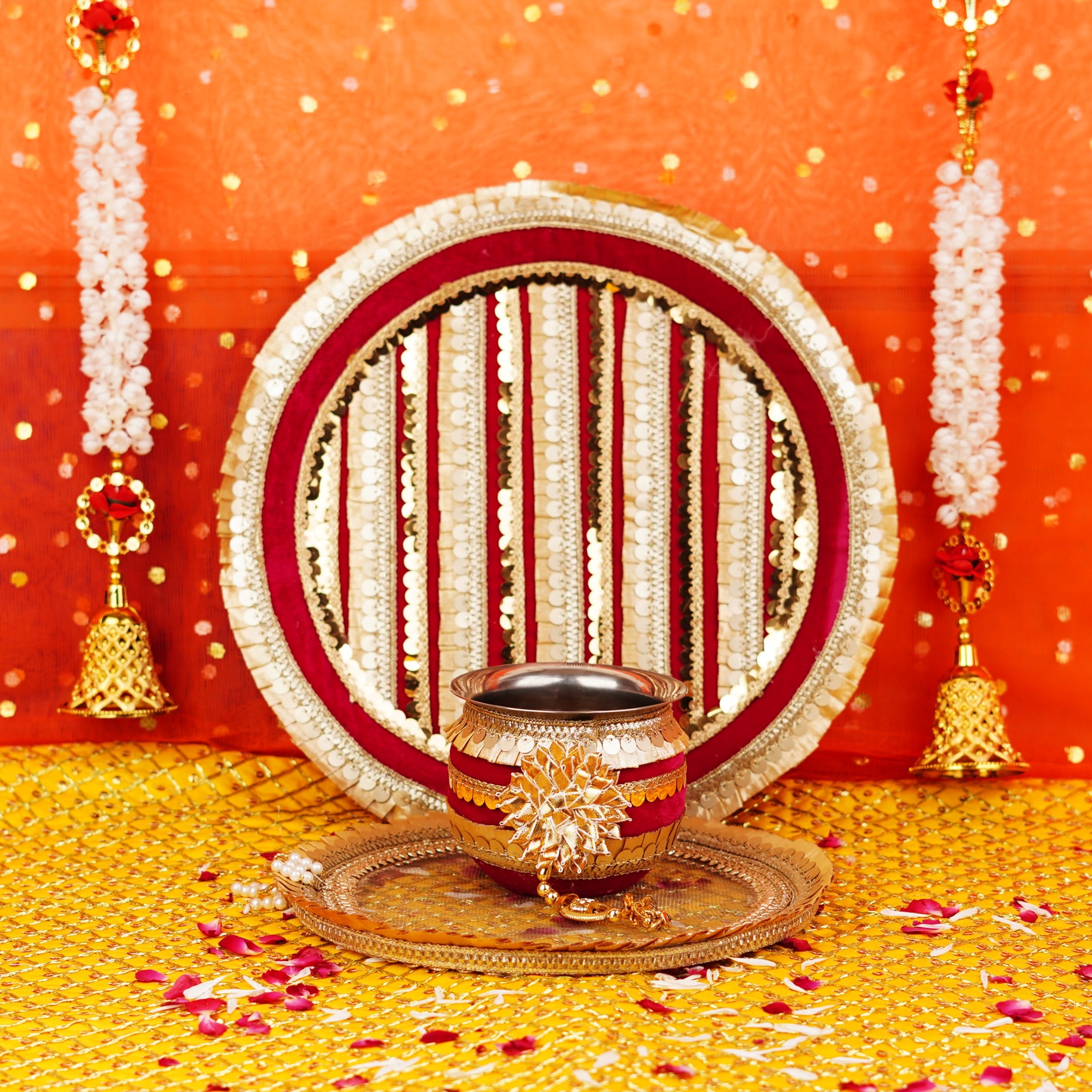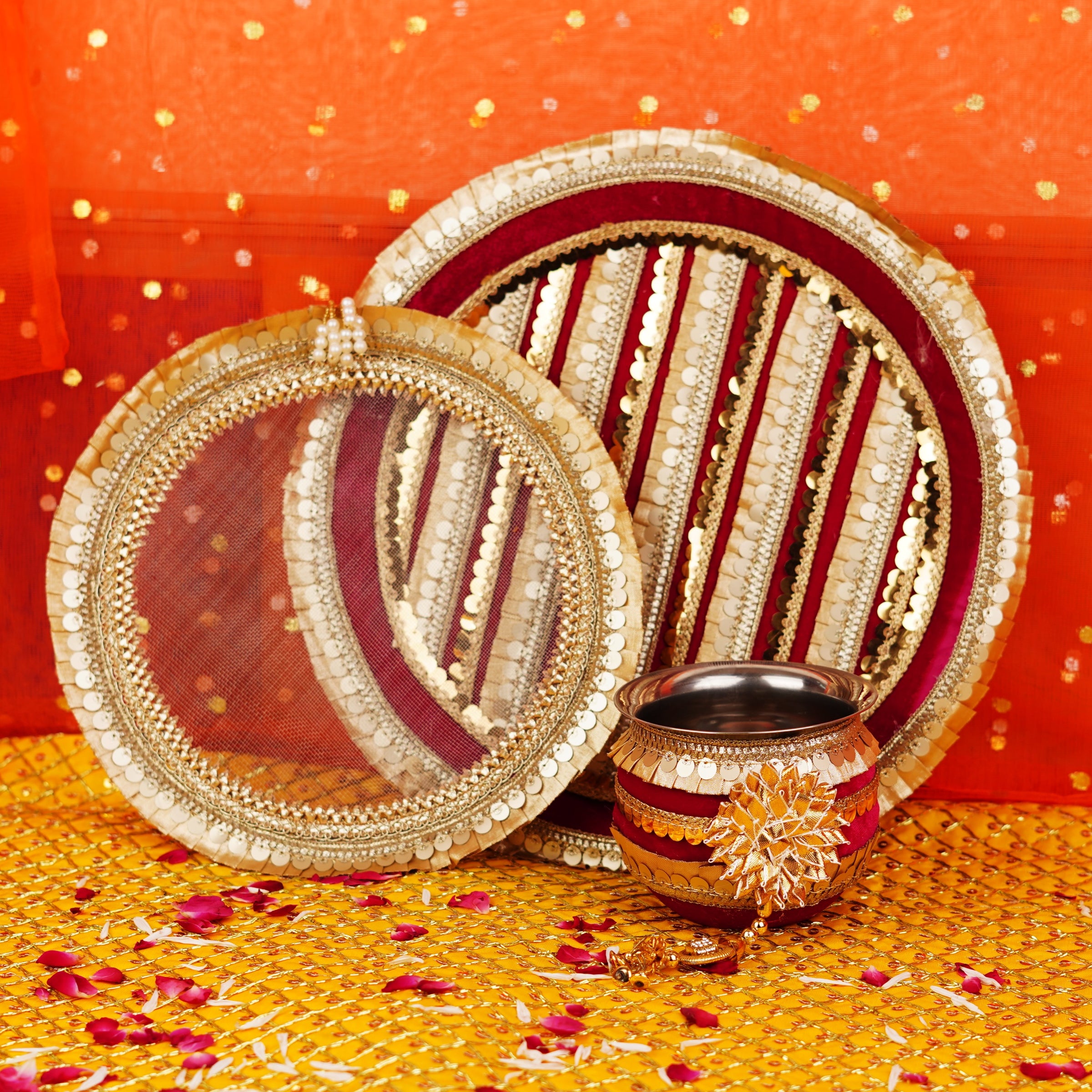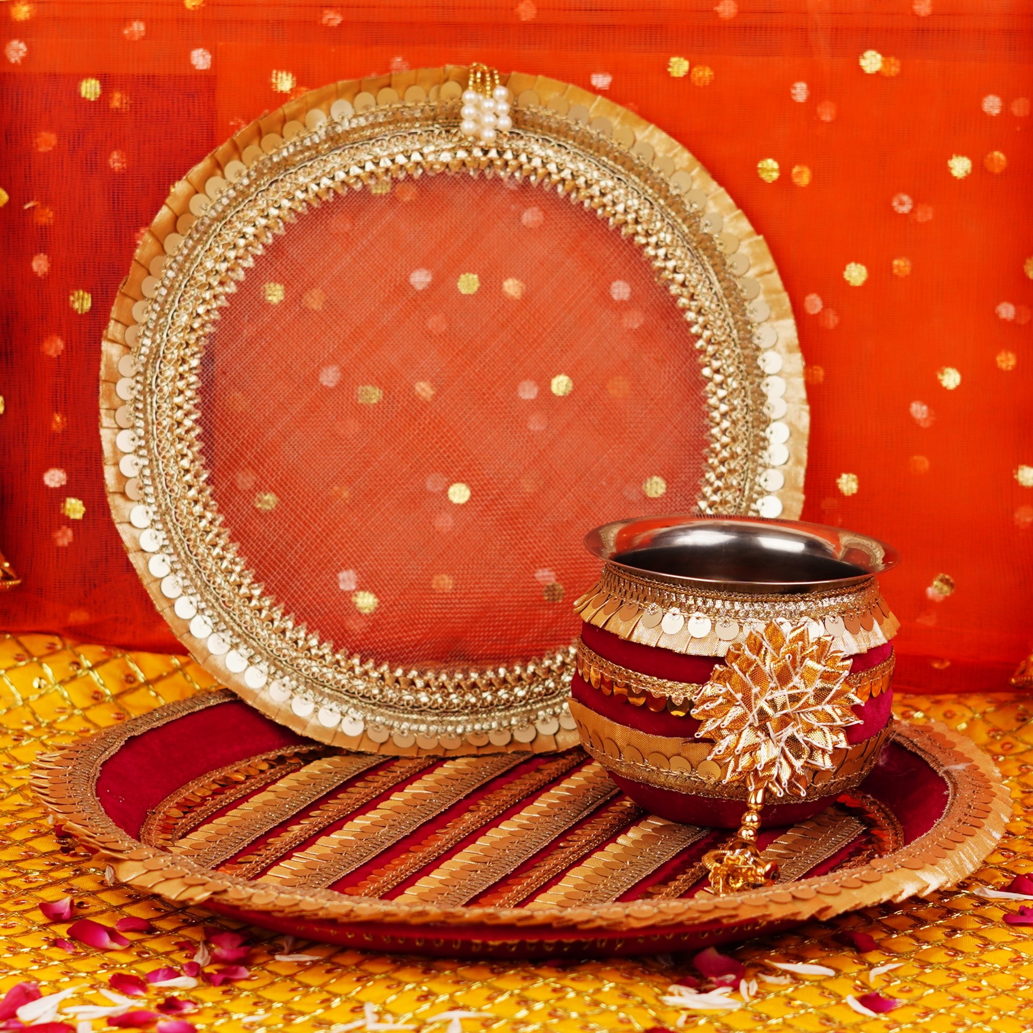 Multilayered Designer Golden and Maroon Karwa Chauth Thali Set