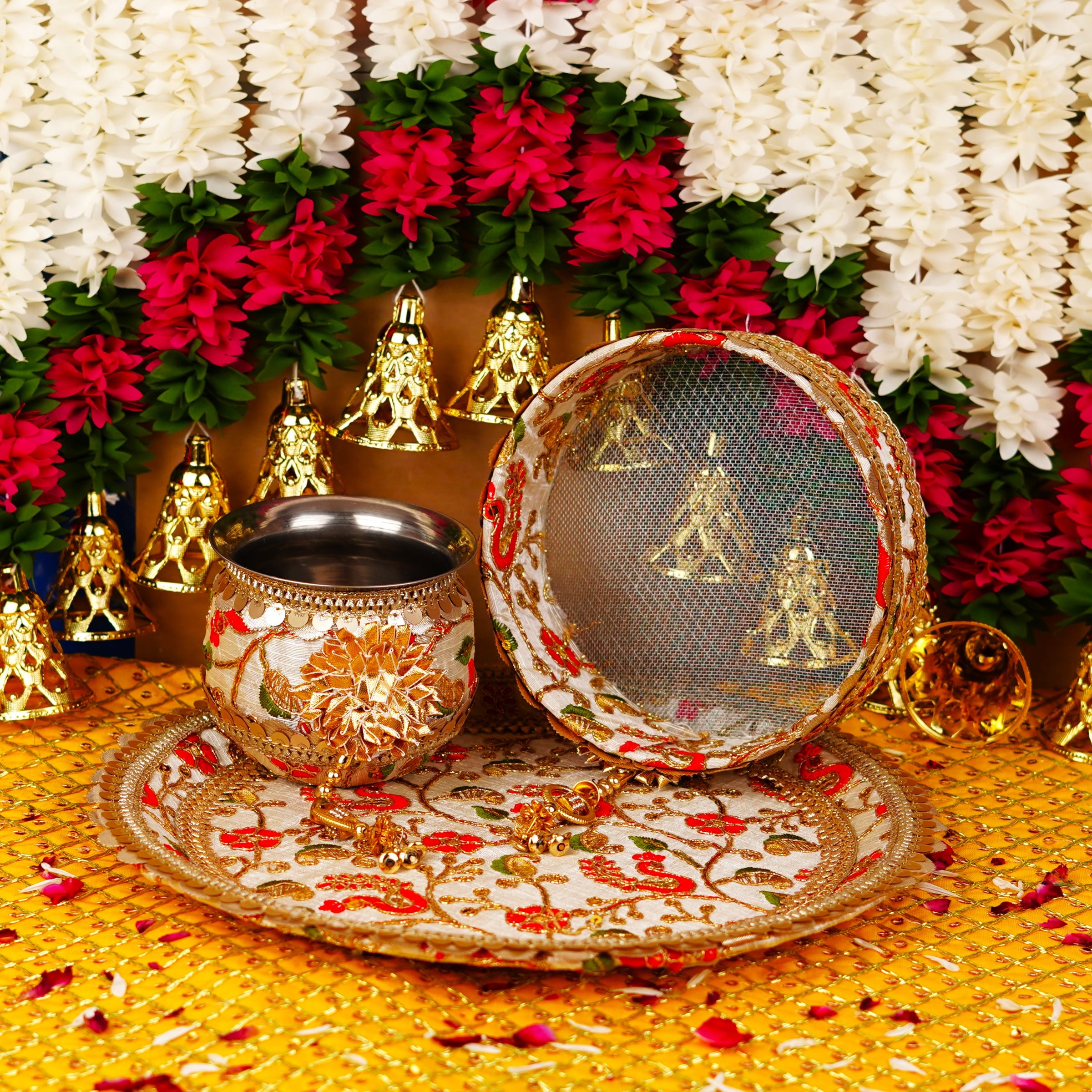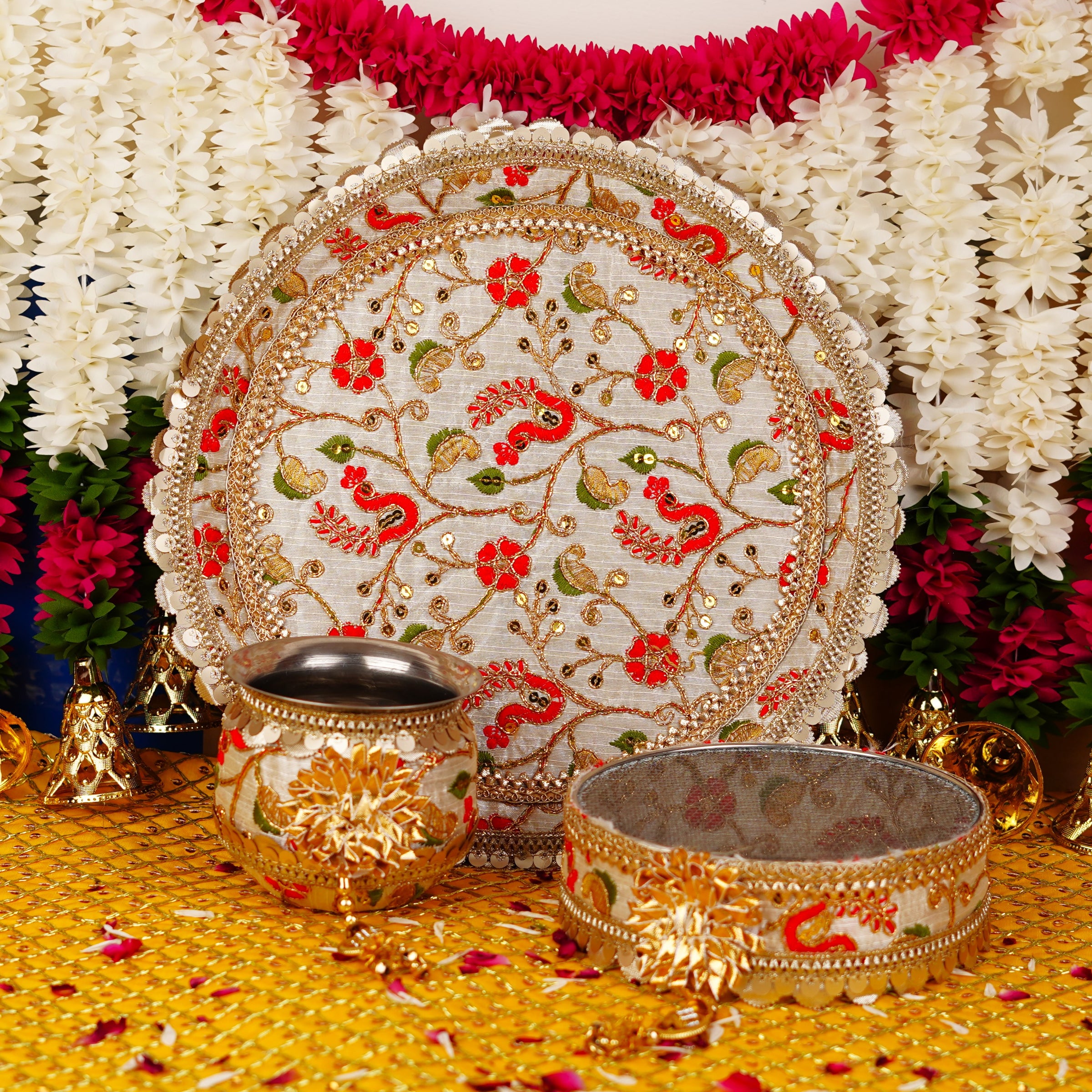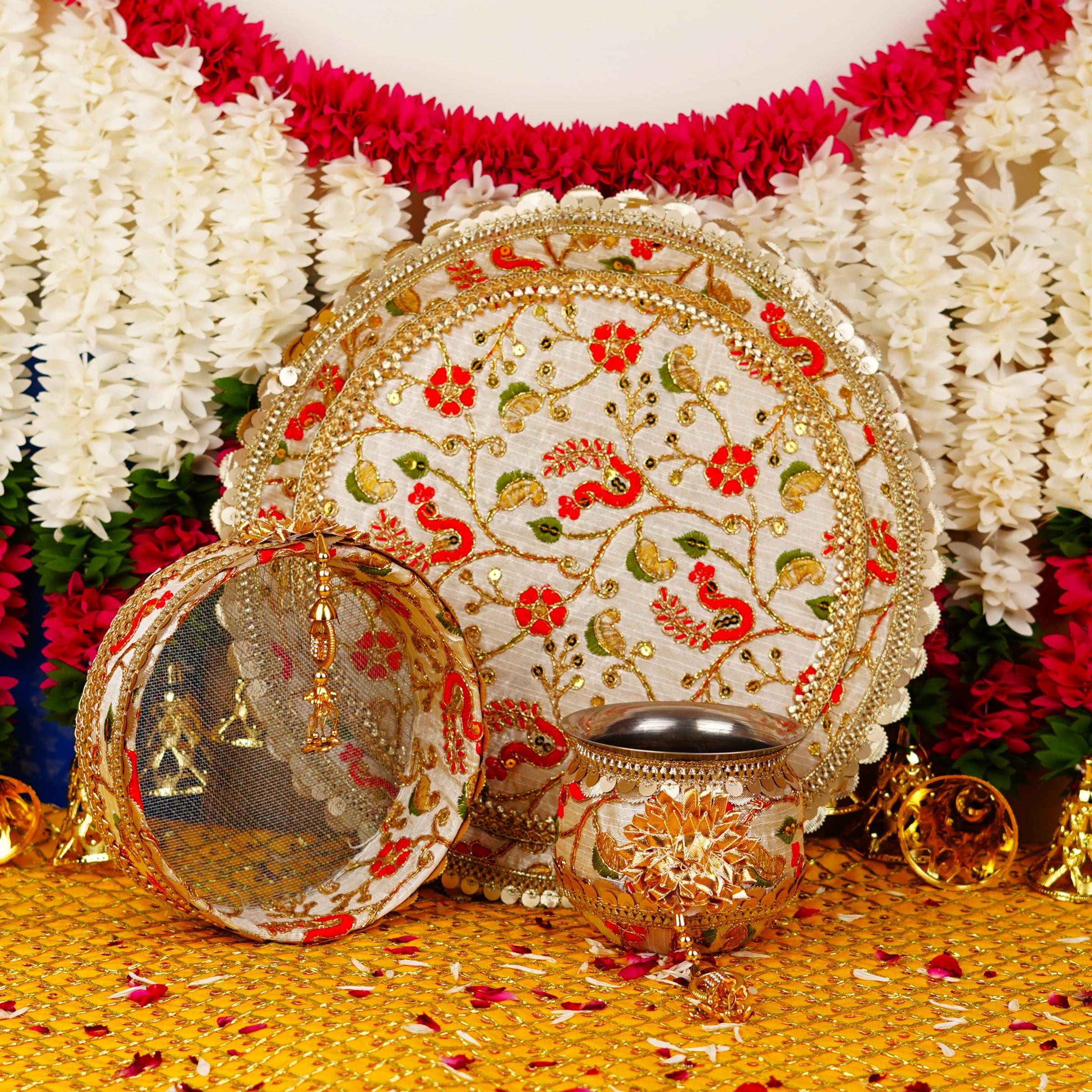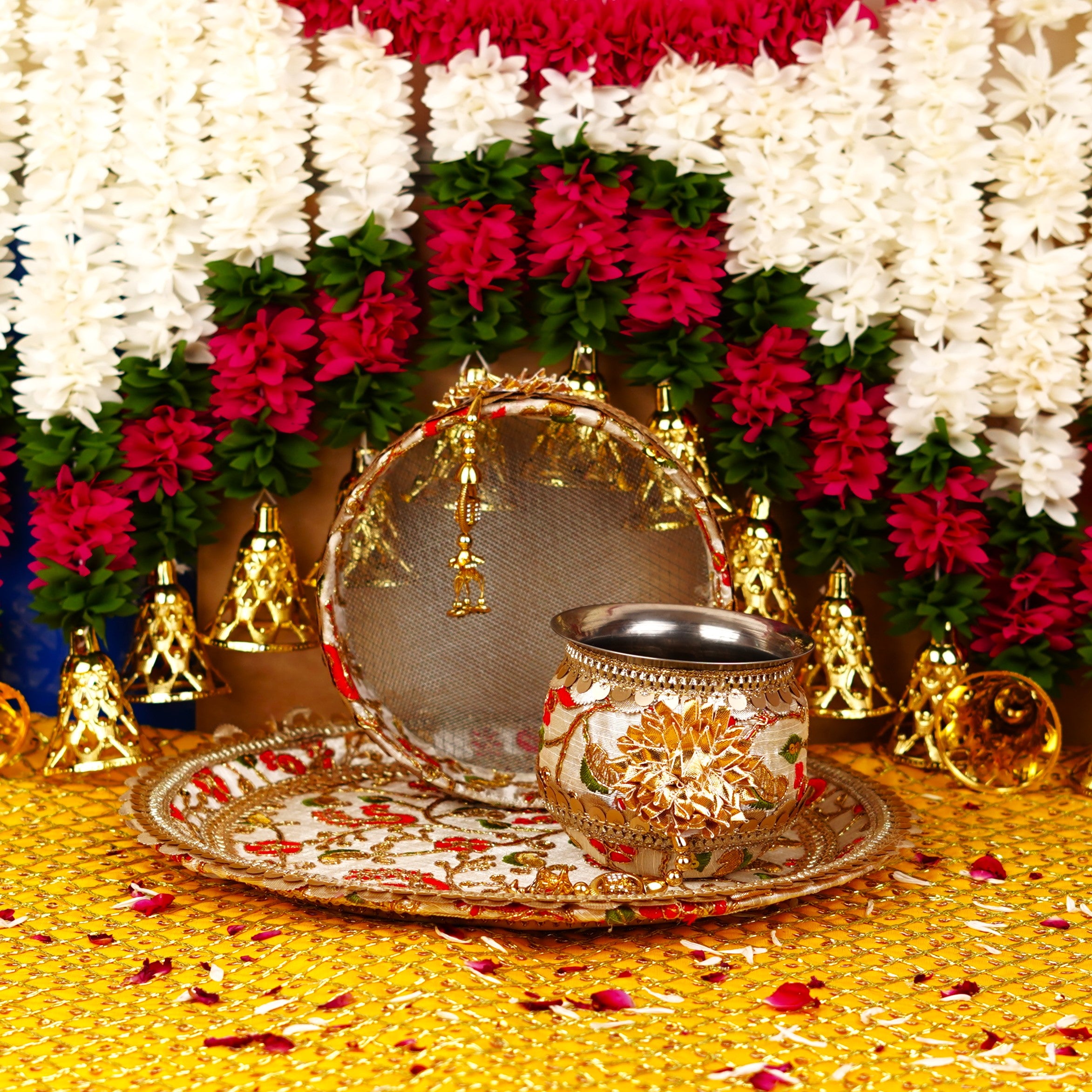 Multicoloured Floral Karwa Chauth Thali Set with Vibrant Birds Motifs