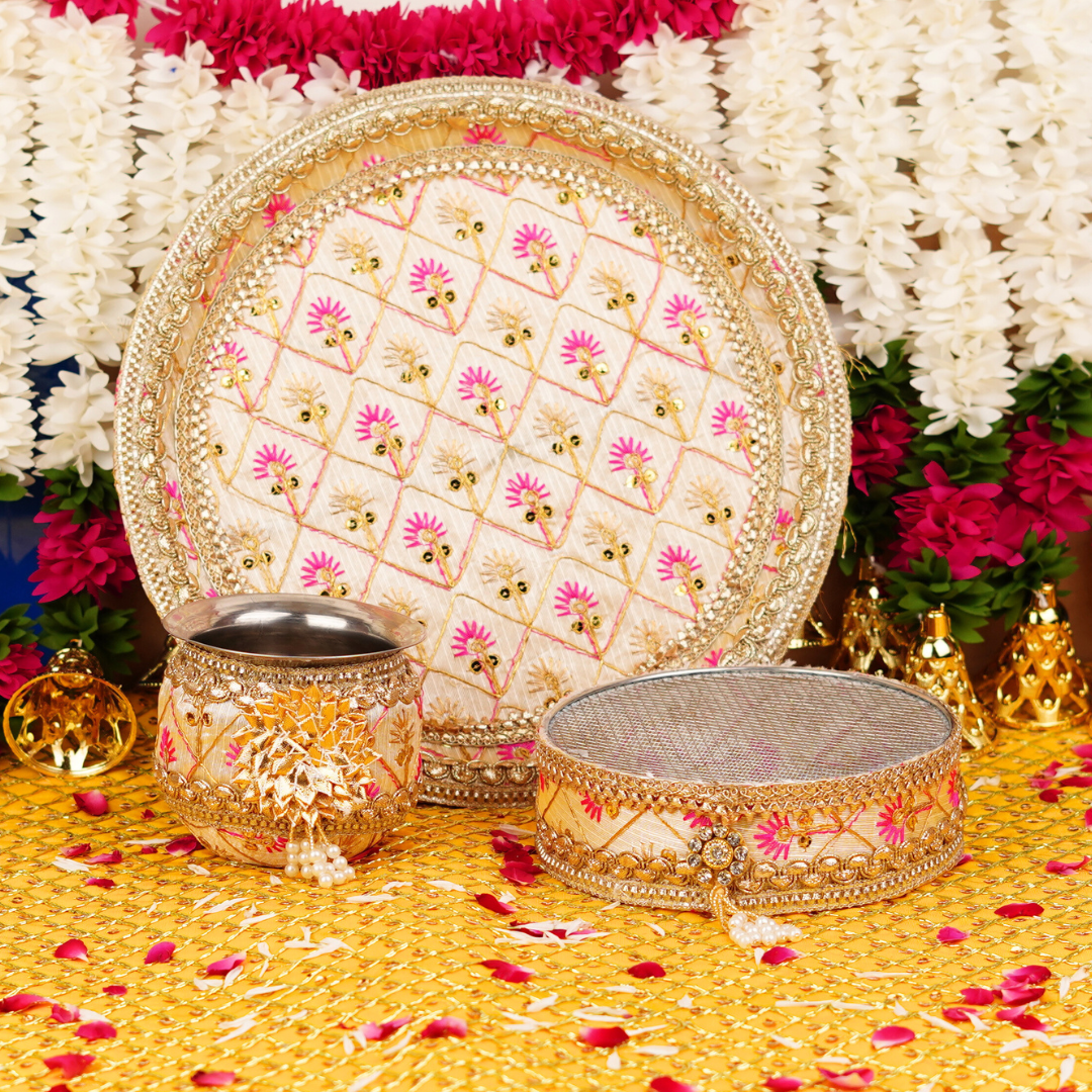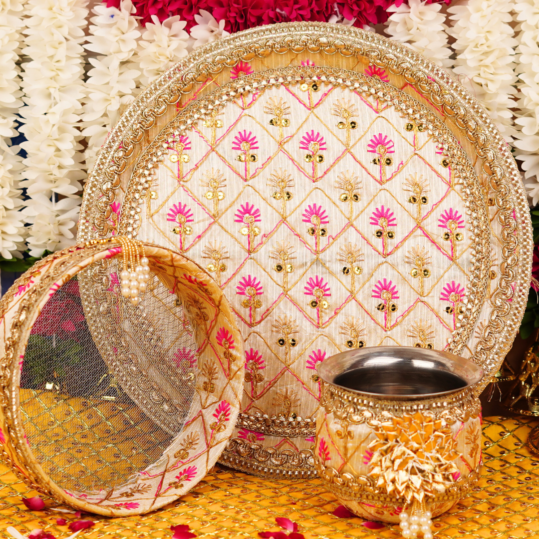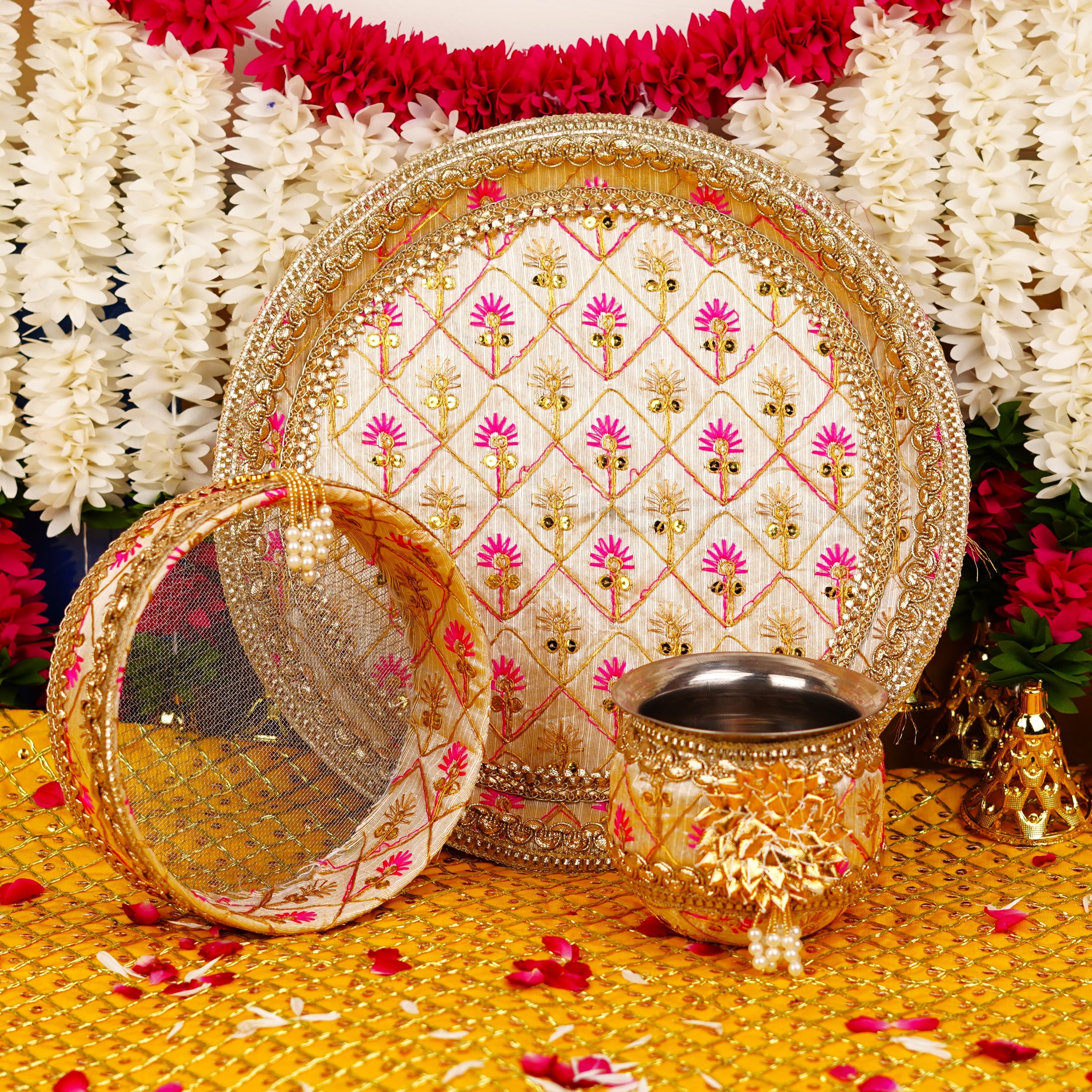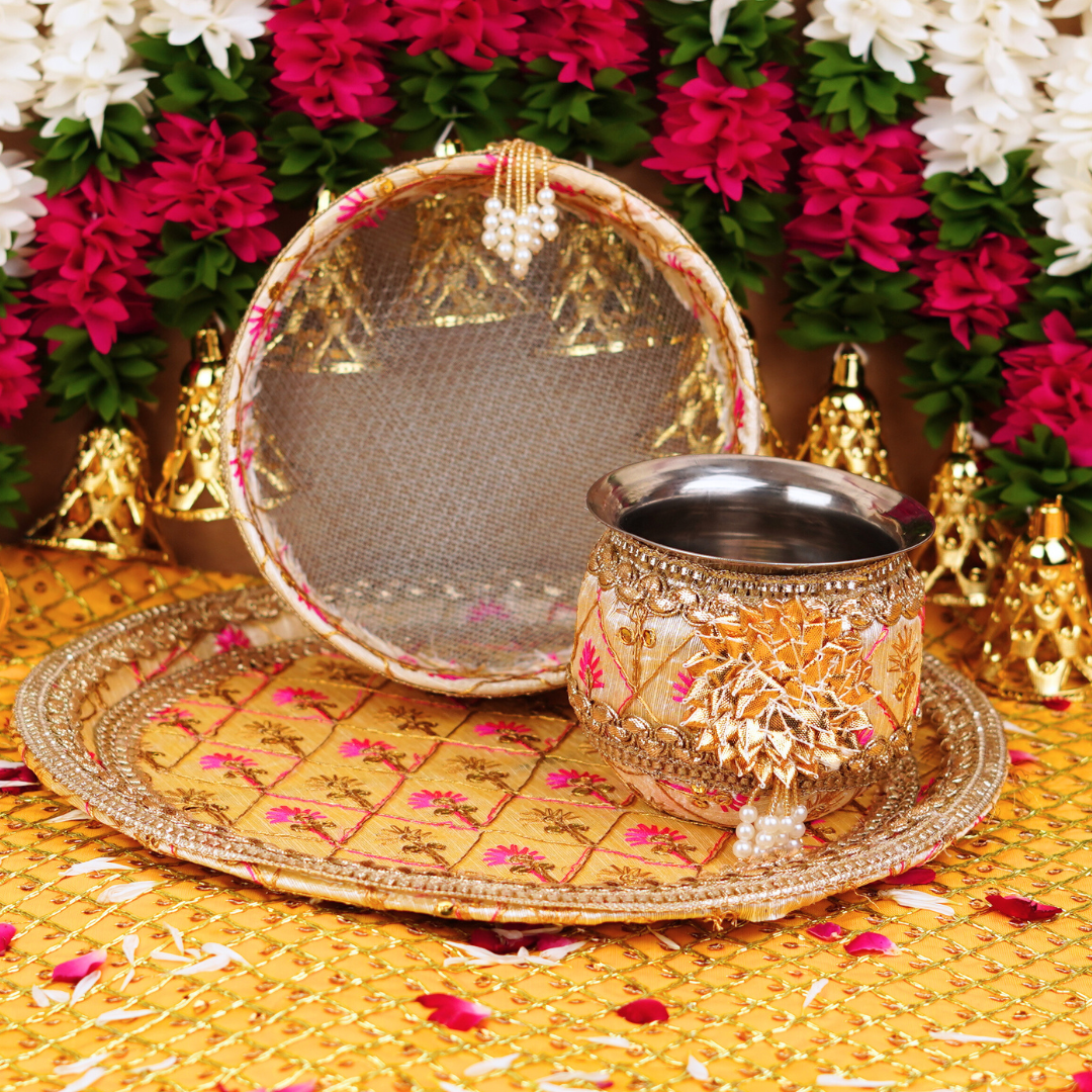 Royal Silver and Gold Karwa Chauth Thali Set with Diamond Grid and Floral Embellishments
